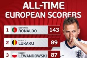 📊 欧洲国家队历史射手榜:凯恩76球进前5名,卢卡库莱万排二三