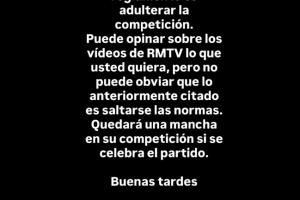 卡瓦哈尔:你好,特巴斯先生。违反规定就是玷污比赛。你可以对此前皇马TV发布的视频发表你想要说的任何意见。但你不能否认之前所提到的内容(海外赛)就是违反了规则。如果进行海外赛,你的比赛就会有污点。