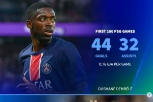 登贝莱:44球32助,场均参与0.76球